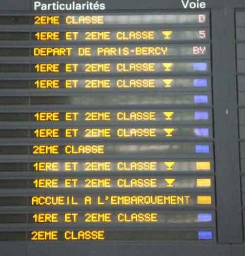 On the display, we find: the type of train (TGV or other), the train number, the time, and the destination, the specifics (first and second class, or only second class), and lastly, the boarding gate or voie. Before the gate number or letter is published, a yellow or blue square informs travelers which platform corresponds to each train.